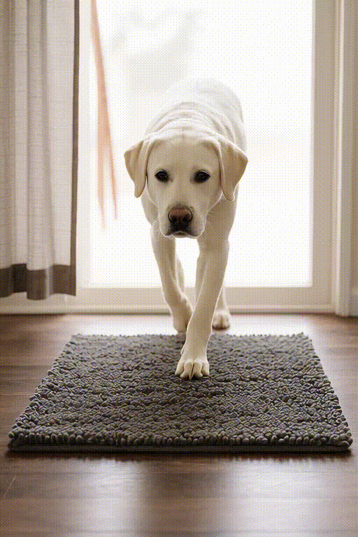 Le Tapis JoliPattes™ absorbe boue, eau et poussière dès que votre chien rentre.